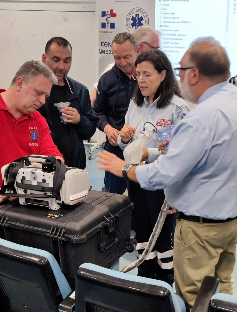Δέκα (10) γιατροί και περισσότεροι από τριάντα (30) διασώστες του ΕΚΑΒ από όλη την Ελλάδα συγκεντρώθηκαν στις εγκαταστάσεις του Εθνικού Κέντρου Άμεσης Βοήθειας (ΕΚΑΒ) στην Αθήνα για τη συγκεκριμένη εκπαίδευση, τόσο θεωρητική, όσο και πρακτική σε περισσότερα γκρουπ ταυτοχρόνως. Τριάντα έξι (36) ασθενοφόρα του Κέντρου θα είναι πλέον εξοπλισμένα με αυτούς τους σύγχρονους αναπνευστήρες.